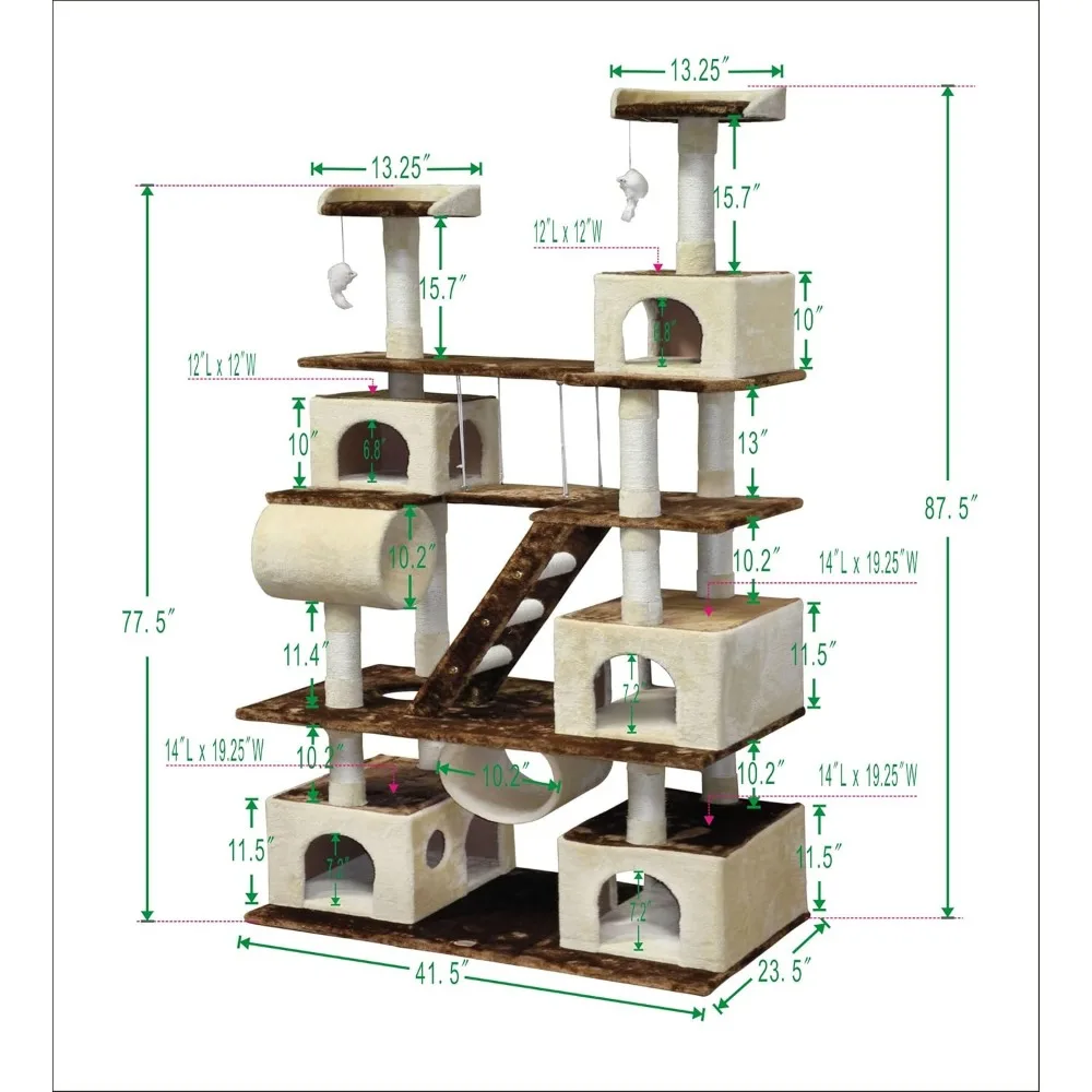 • * Overall Size : 42″L x 23.5″W x 87.5″H * 3 Big Condo Houses Size: 19.25″W x 14″L x 11.75″H * 2 Condo Houses Size: 12″W x 12″L x 10H * Size of 2 Top Perches : 13.25″Dia x 3″H * Size of 2 Tunnels : 10″Dia x 12″L * Number of Ladder : 1